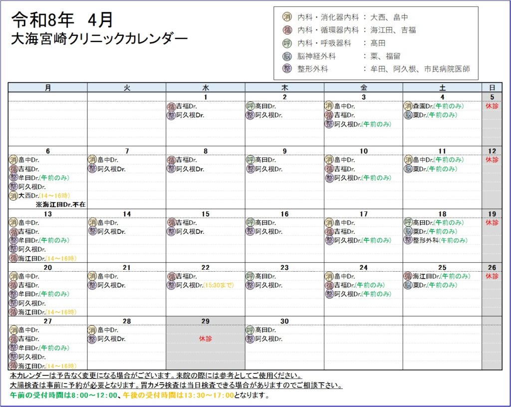 R8年4月 医師診療カレンダー